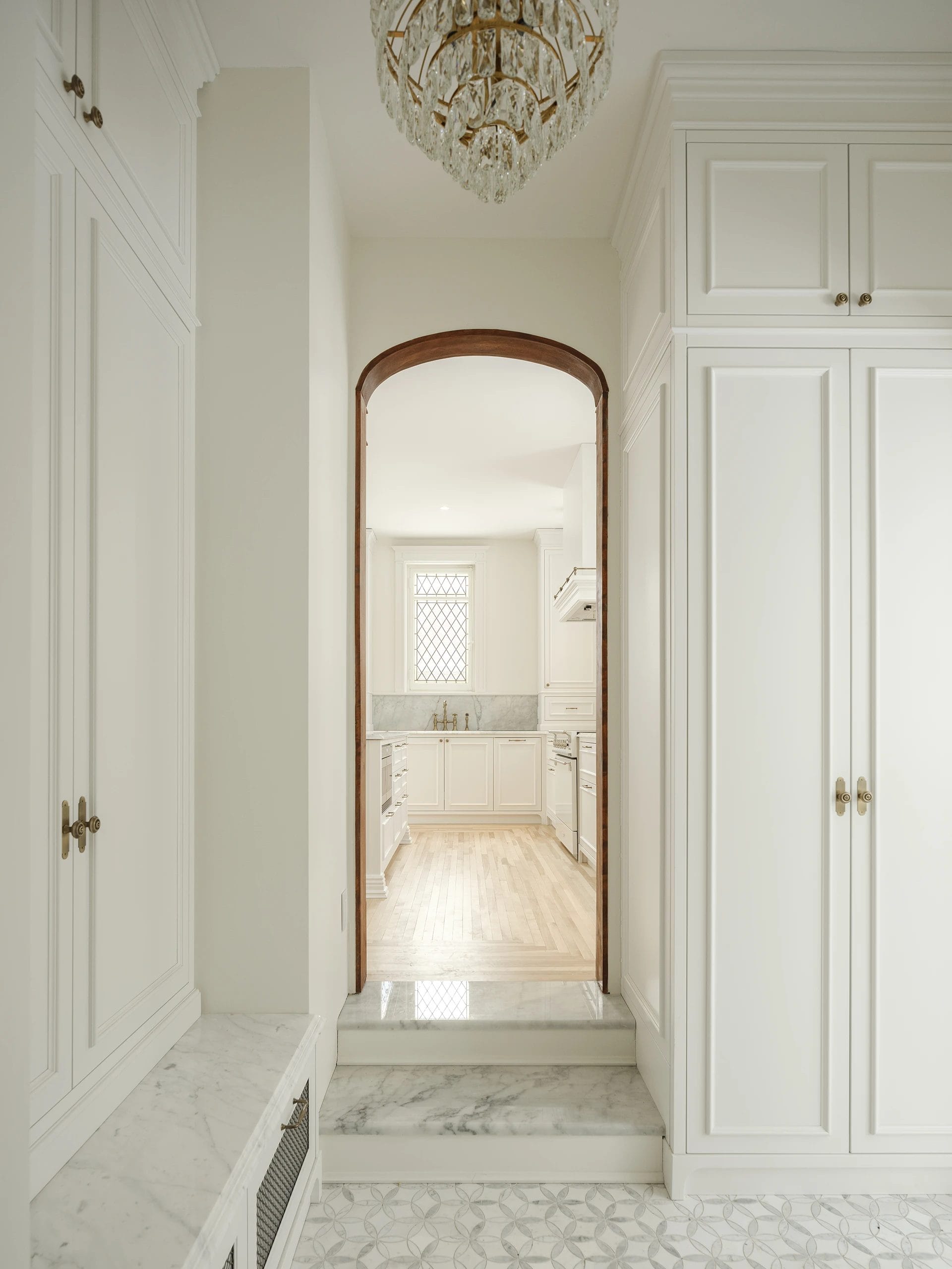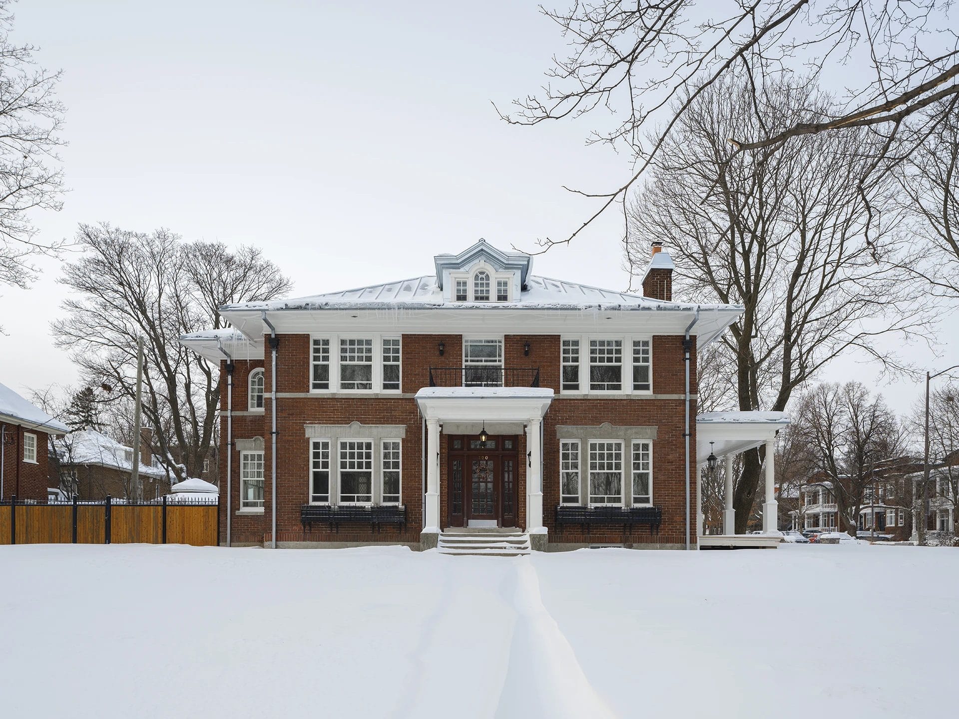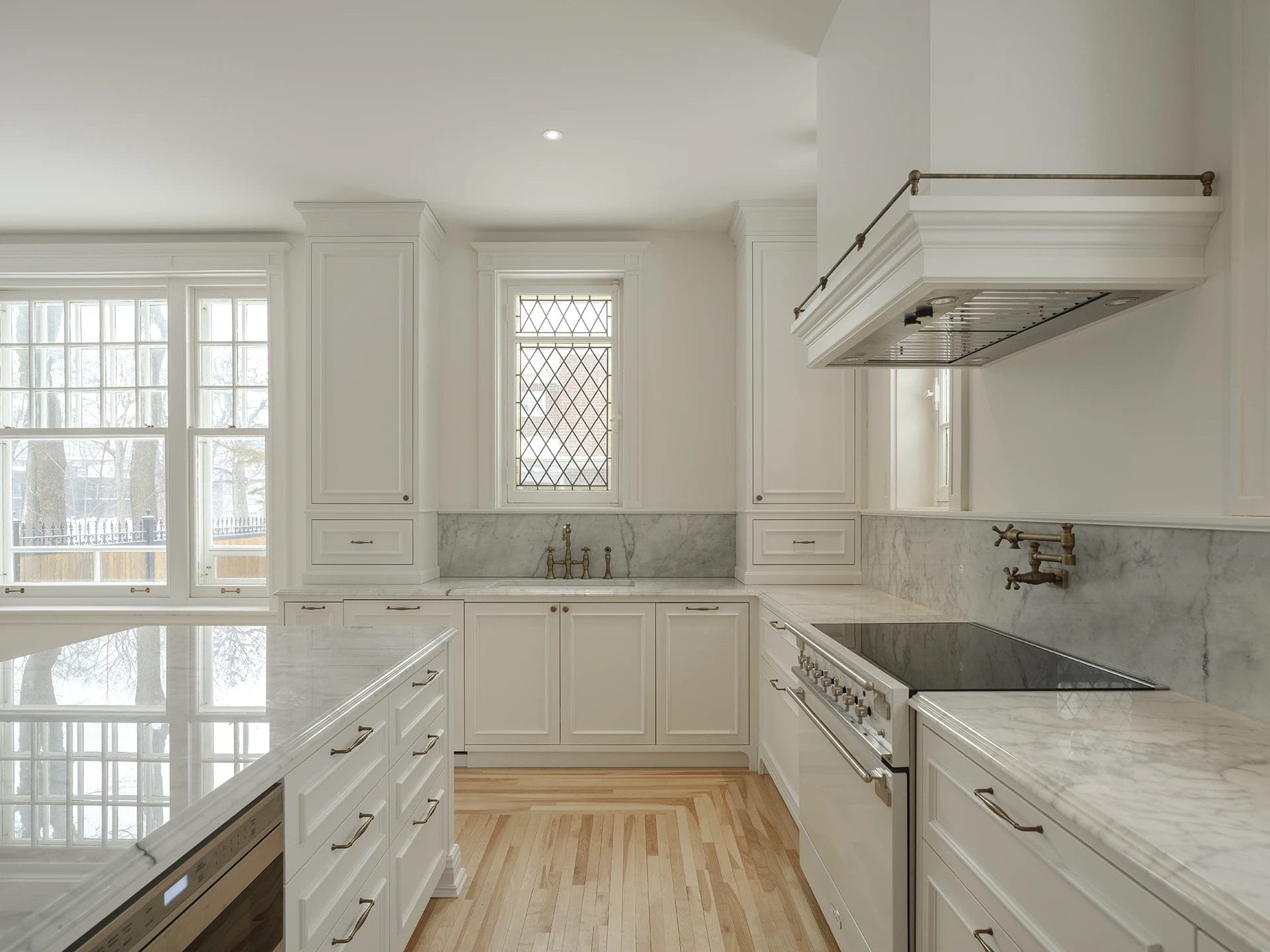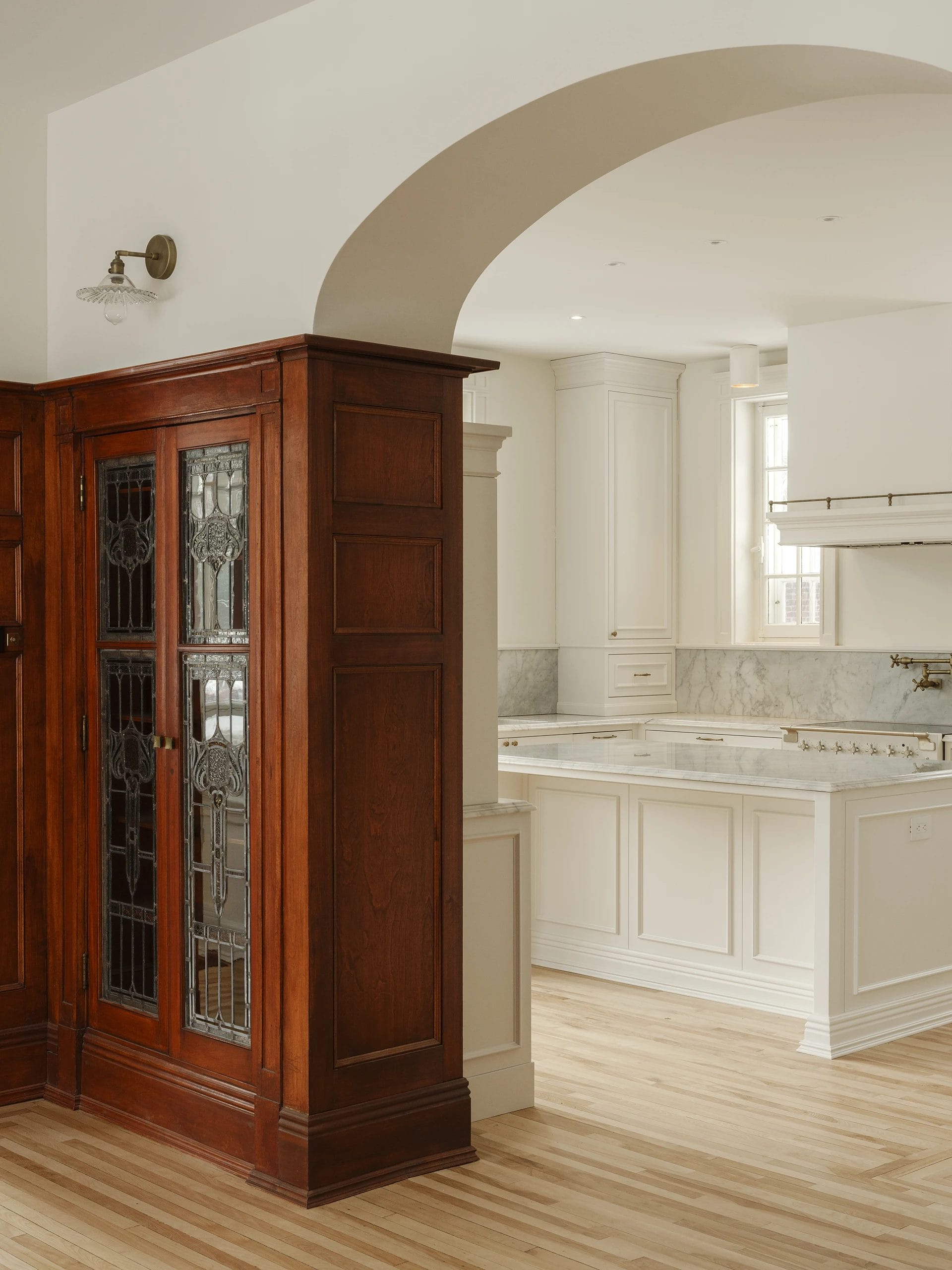 Le parti architectural se définit par la clarification des circulations à l’intérieur de la maison. L’entrée principale à l’avant et l’entrée secondaire à l’arrière se font face et partage désormais le même hall d’entrée et le même escalier monumental qui dessert tous les niveaux. Ainsi, les différentes pièces, à commencer par la cuisine, le séjour et le hall de l’étage, sont connectées à cet axe central qui organise également la symétrie architecturale des façades à l’extérieur. La restauration des boiseries sur les murs intérieurs, l’intégration de matériaux nobles comme le marbre et l’ébénisterie aux lignes classiques ravivent l’âme patrimoniale et noble de cette résidence judicieusement positionnée face aux Plaines d’Abraham.